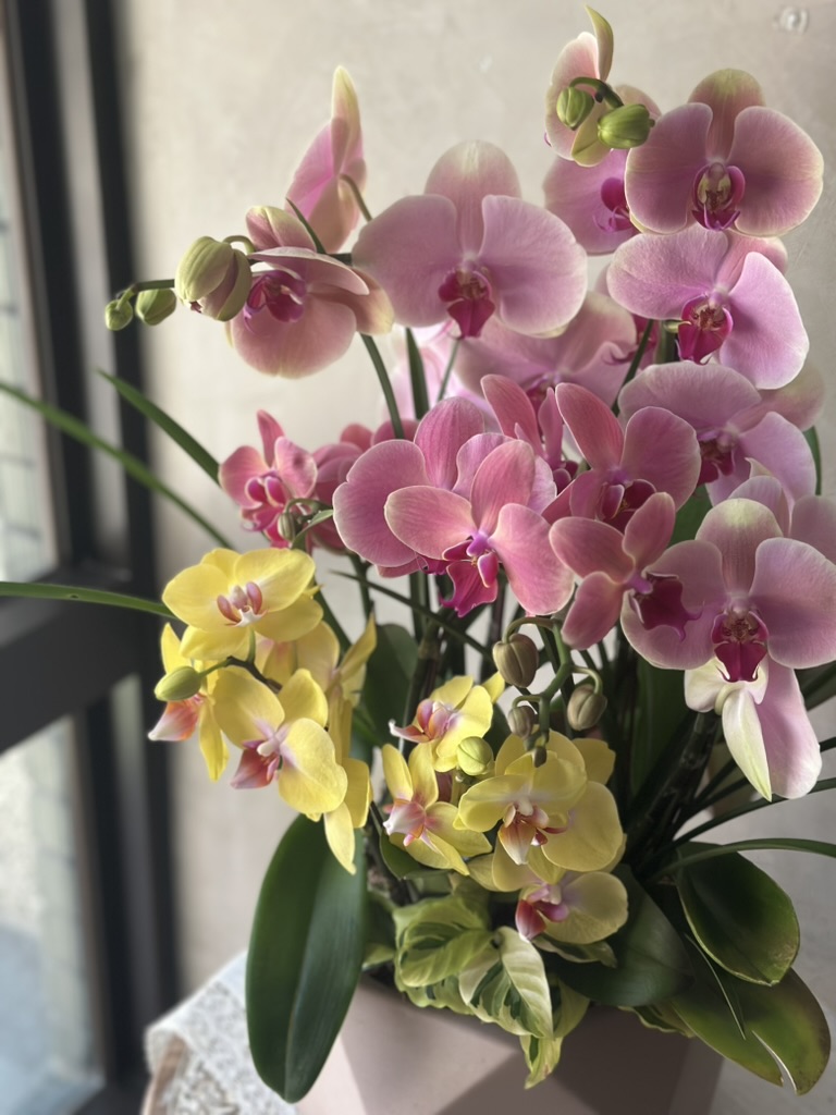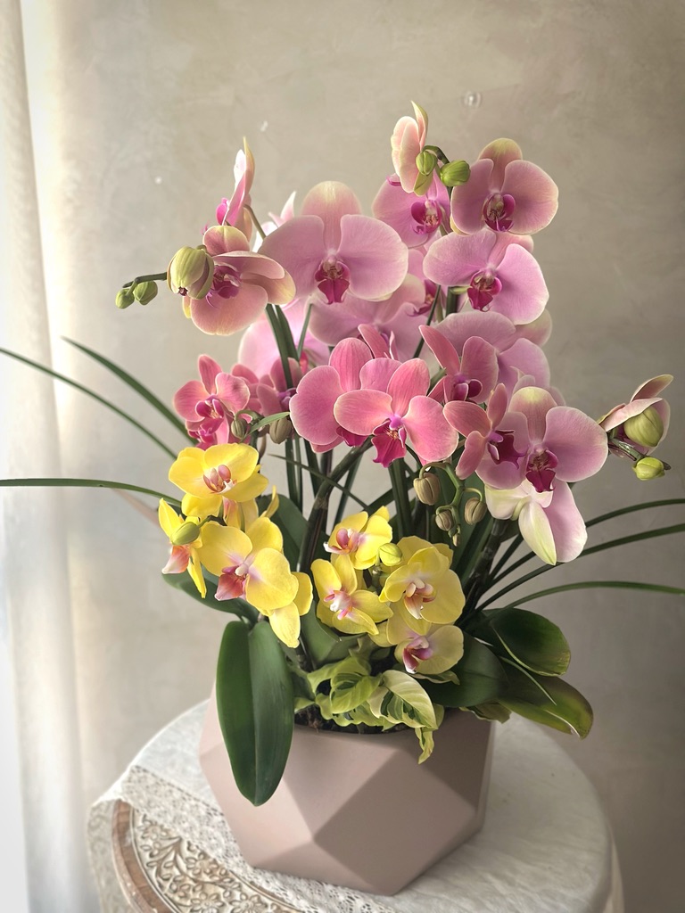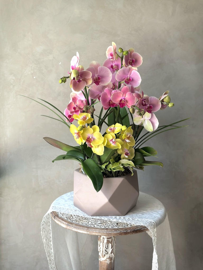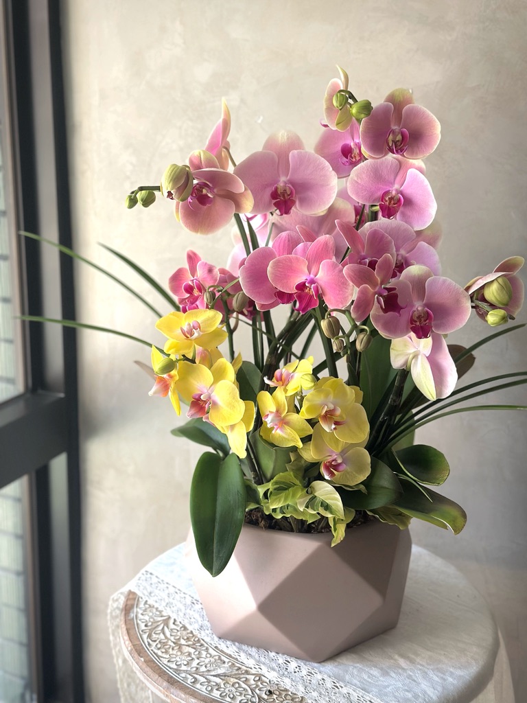 粉紫,蜜桃粉,與亮黃色蝴蝶蘭交織而成的優雅對比,如同陽光灑落於花間,綻放出奢華又充滿活力的氣息。造型精緻的幾何花器,搭配飄逸的綠色葉片,將自然與現代感完美融合,適合各種空間點綴,為日常增添時尚氛圍。