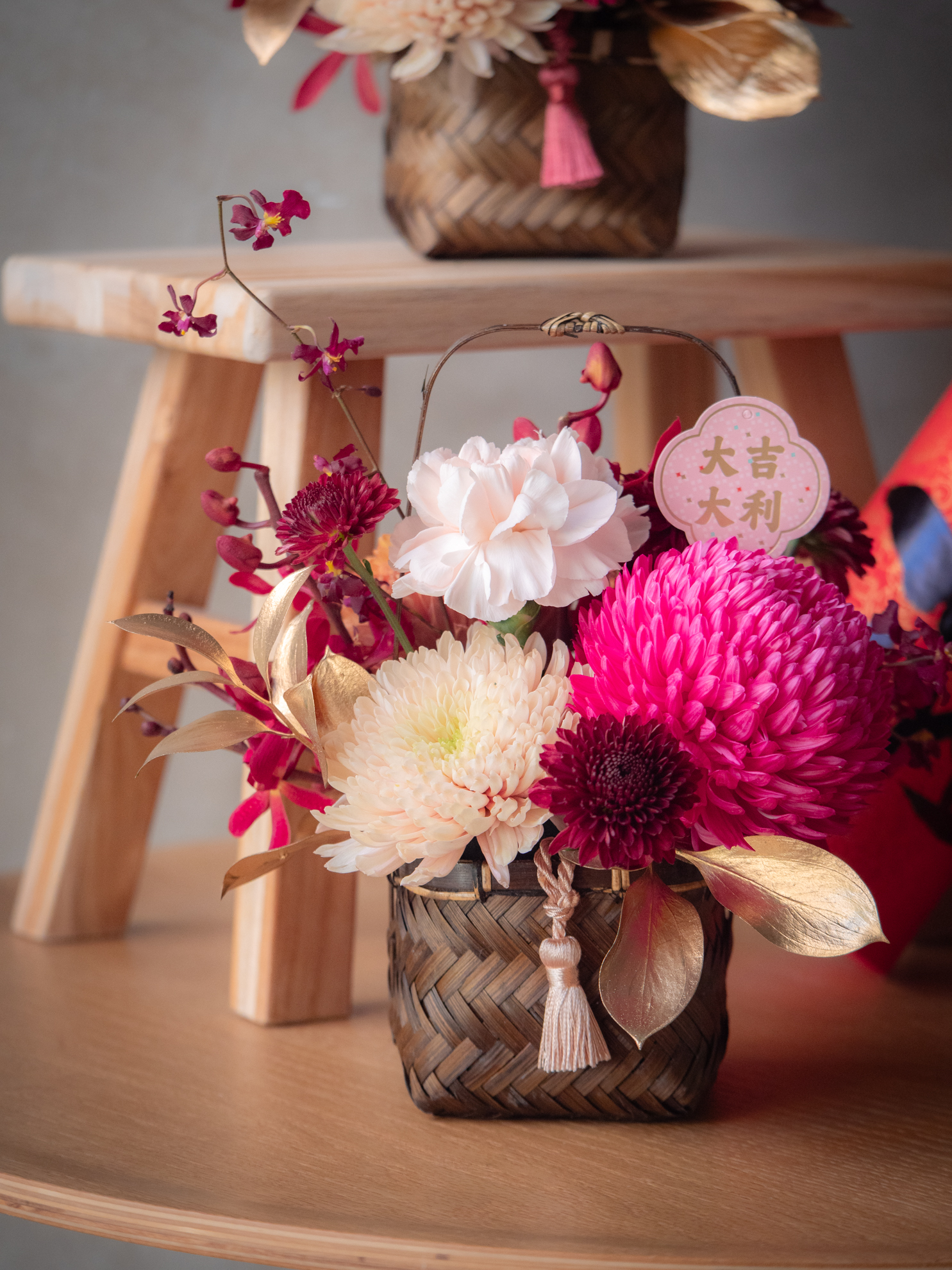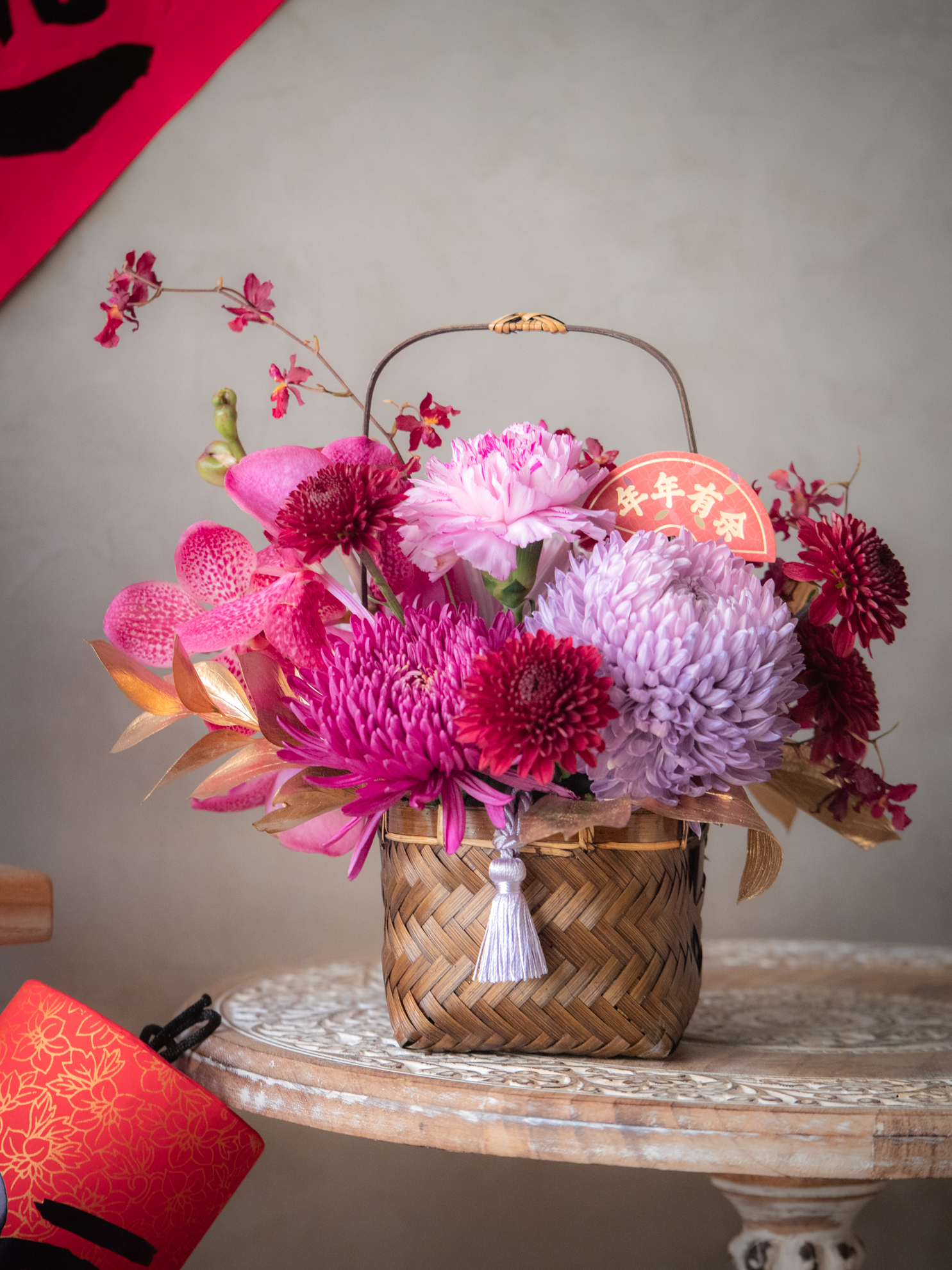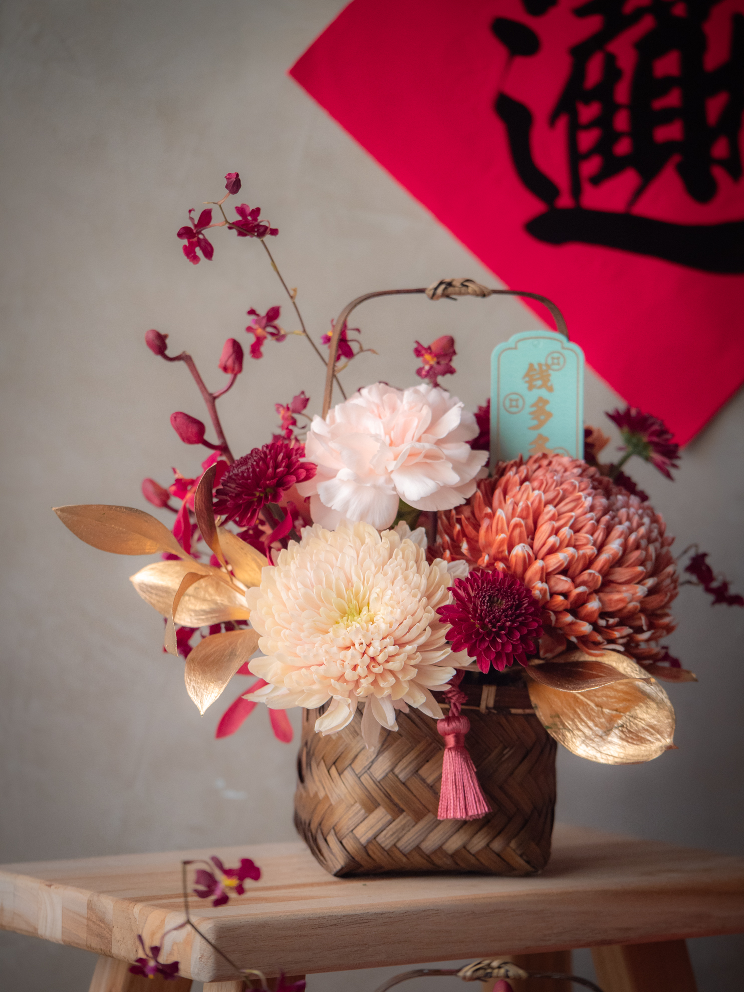 材料:牡丹菊,各種蘭花,各種大菊花,文心蘭,進口大康乃馨,金葉材,進口小菊,異材裝飾,編織竹花籃