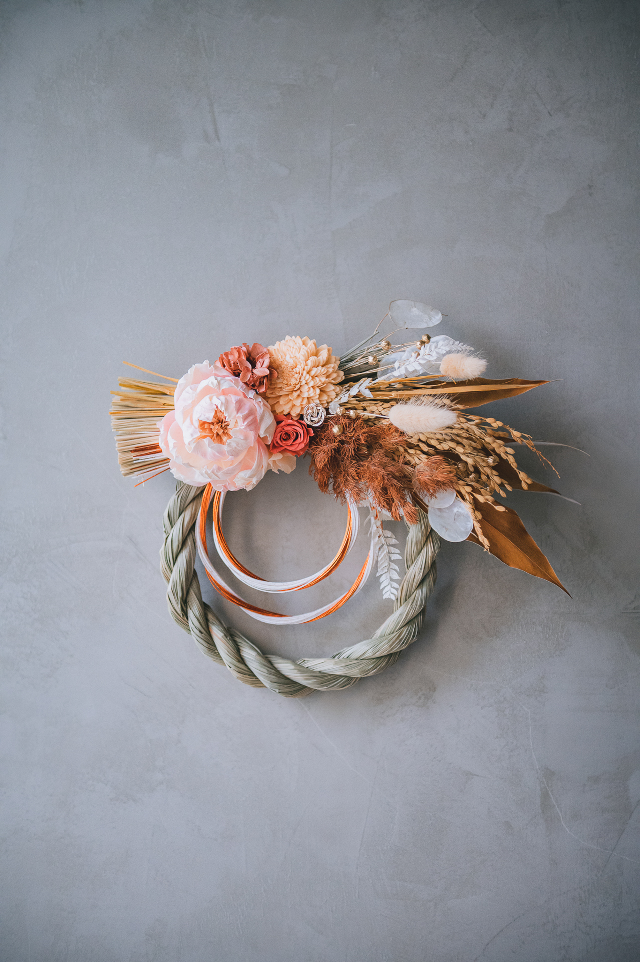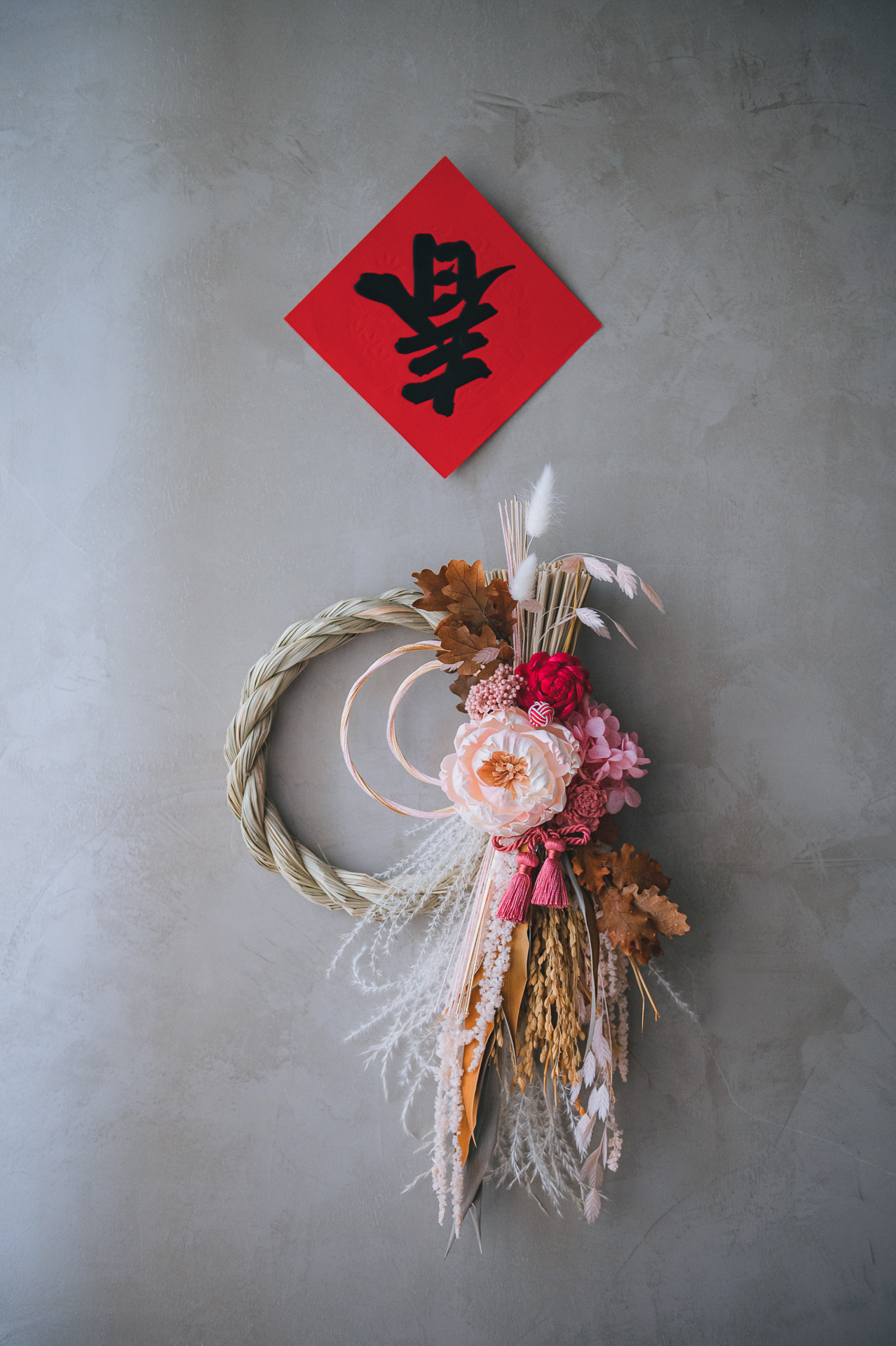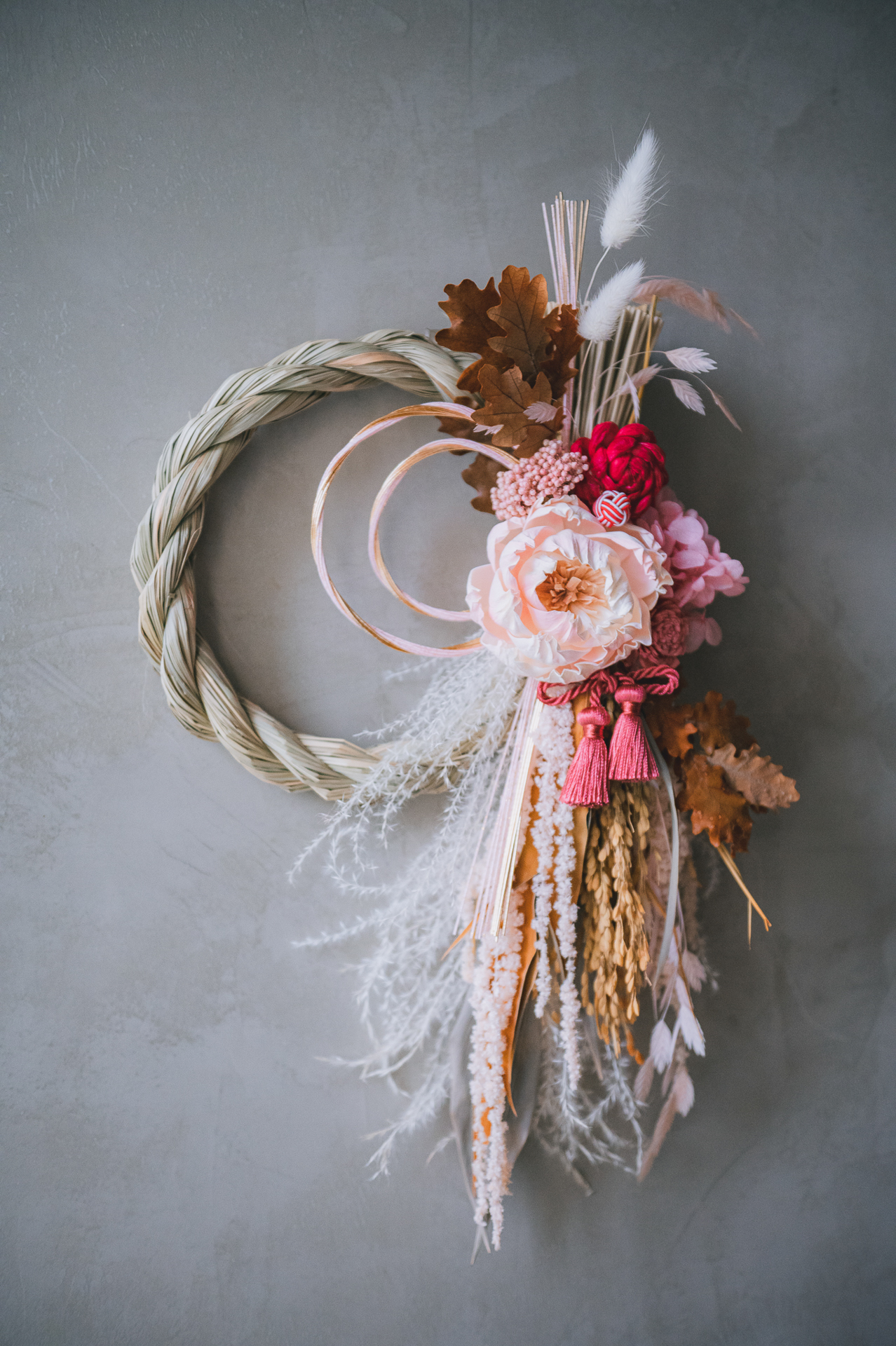材料:永生花材,葉材,索拉花,乾燥花材,異材裝飾,草編注連繩Φ22cm圈
