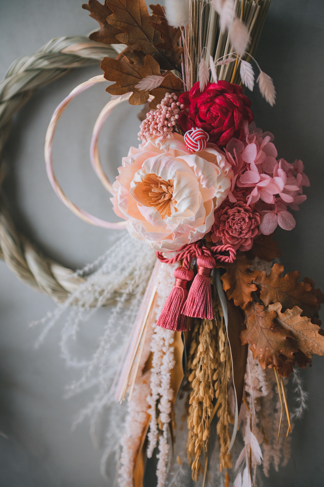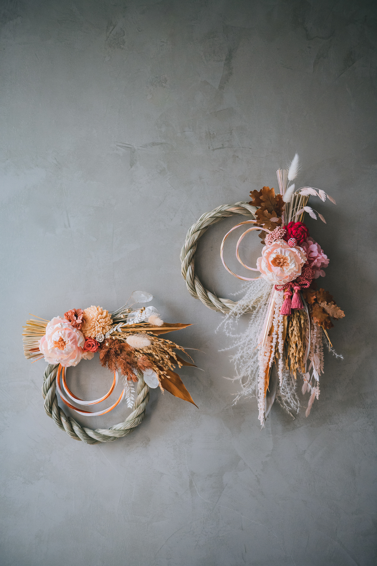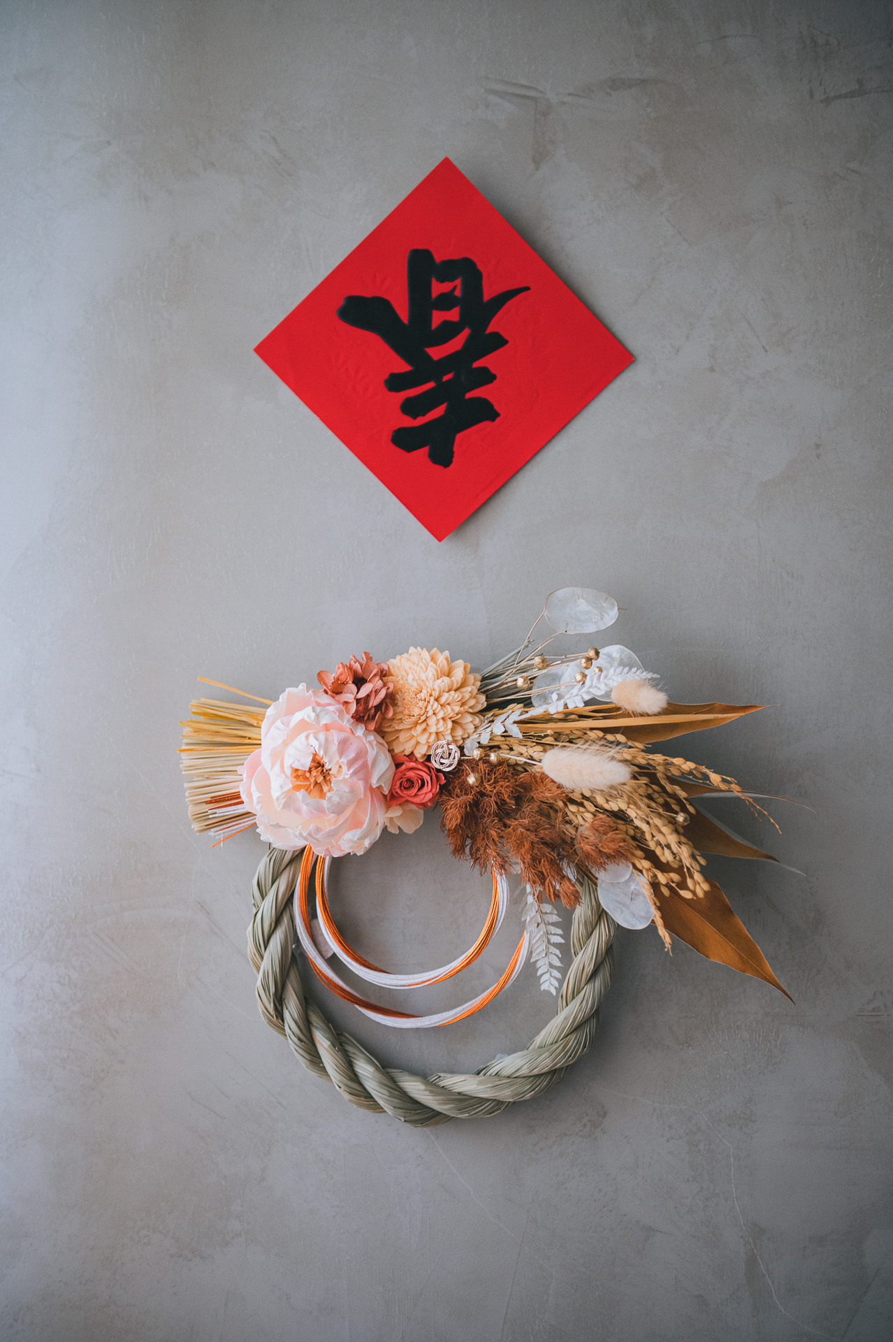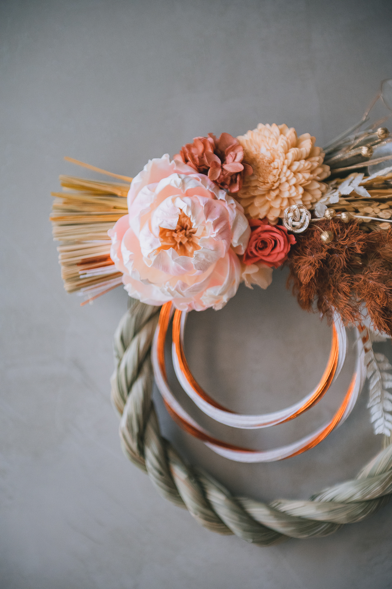 材料:永生花材,葉材,索拉花,乾燥花材,異材裝飾,草編注連繩Φ22cm圈
