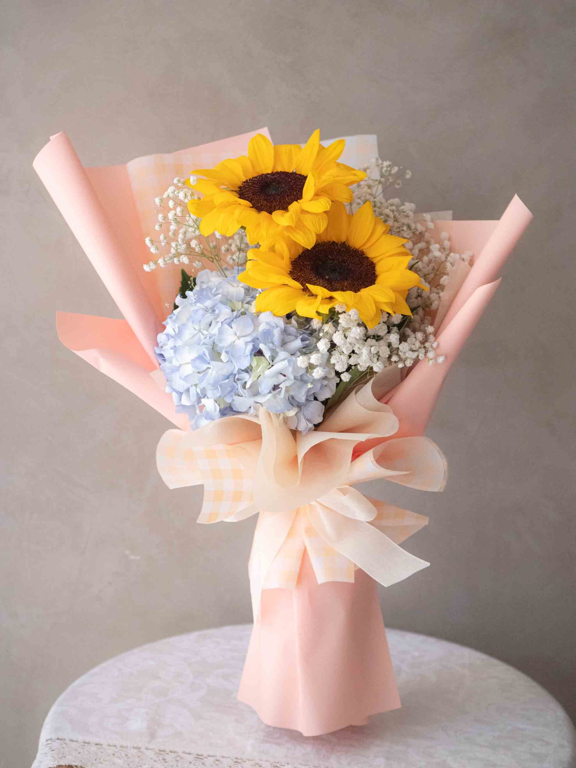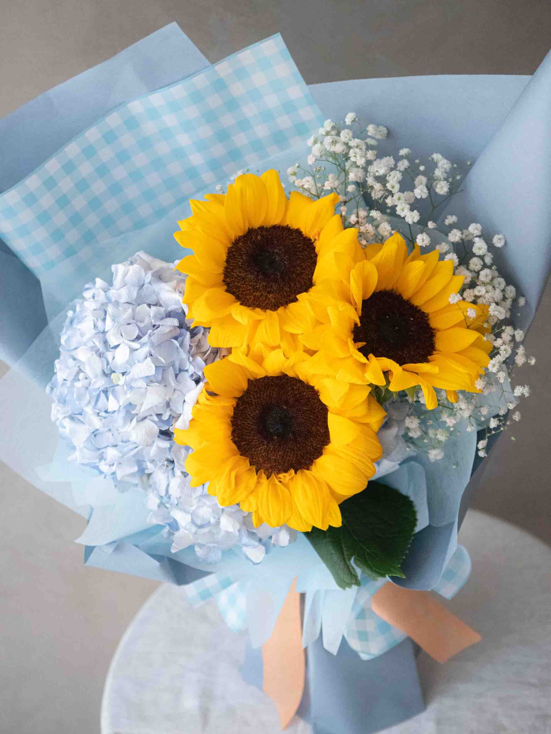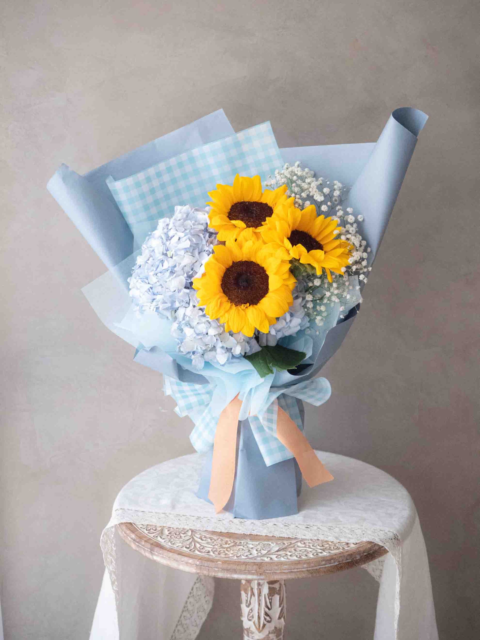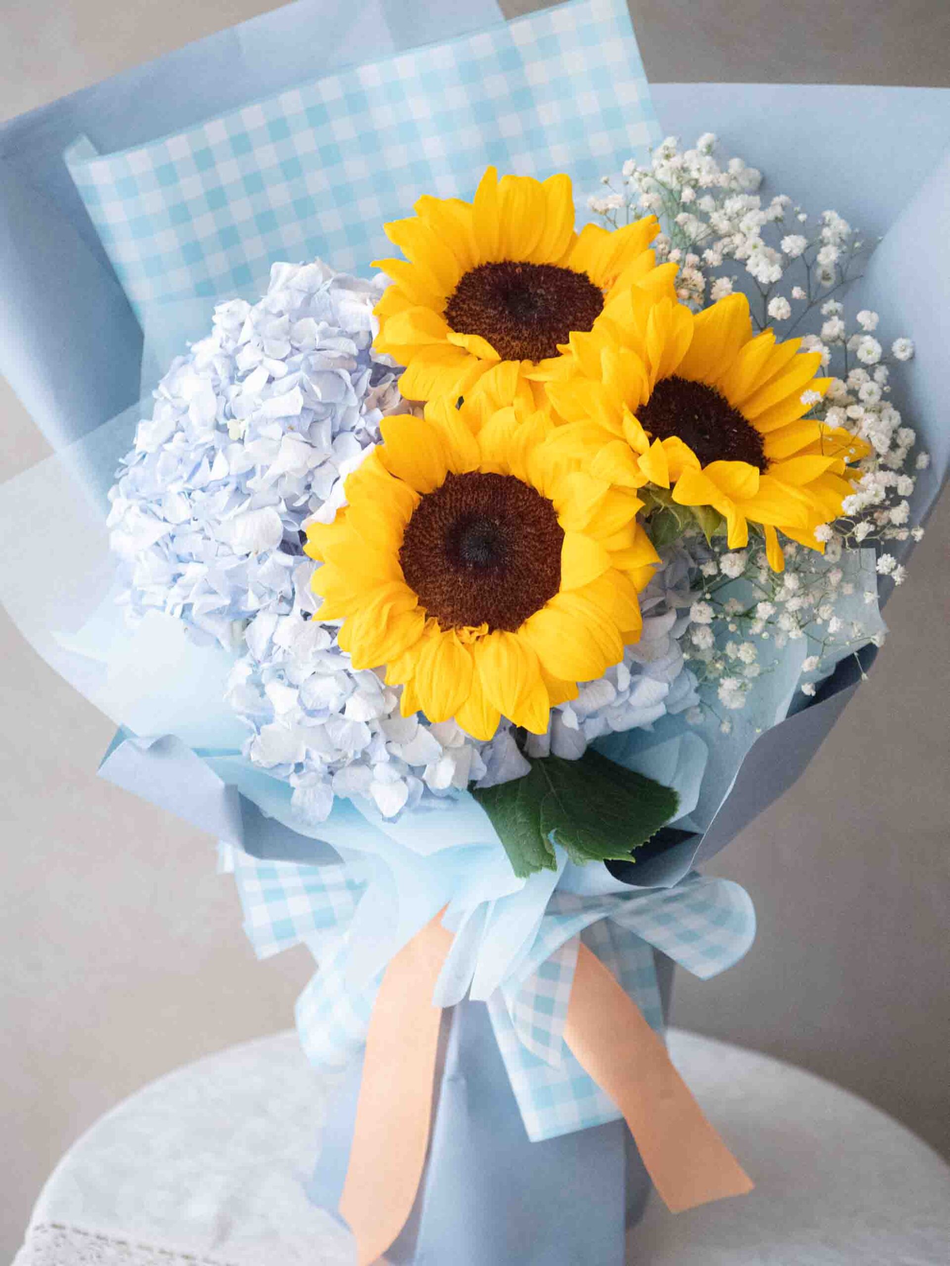 以明亮格紋為基底,搭配盛開向日葵、藍色繡球花與純白滿天星,營造出晴朗盛放的朝氣氛圍。橙色緞帶點綴,增添溫暖與活力。
