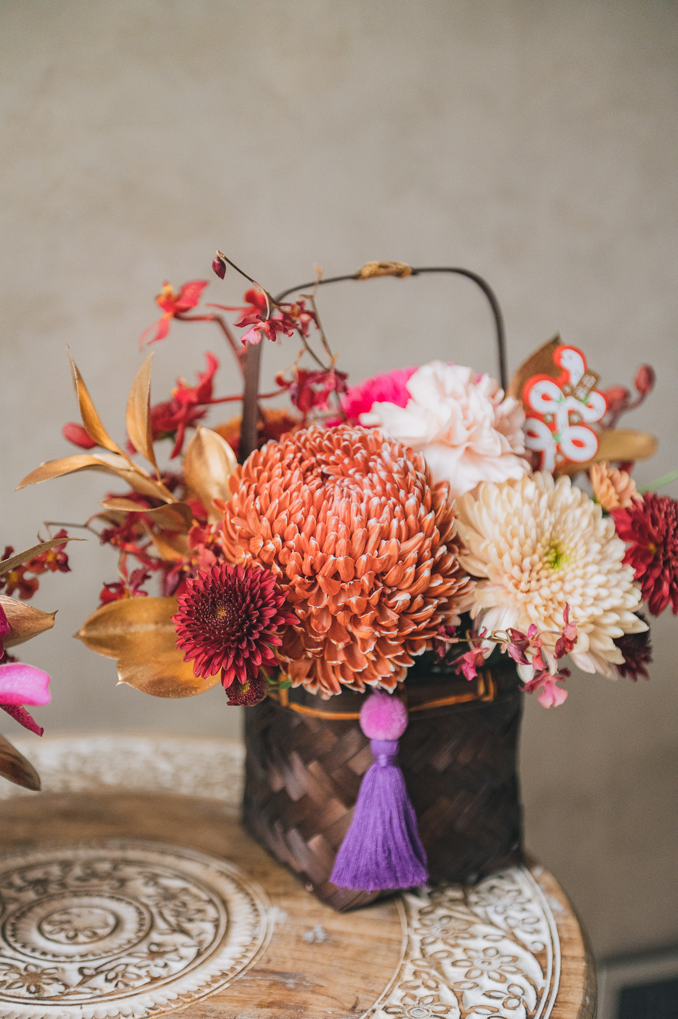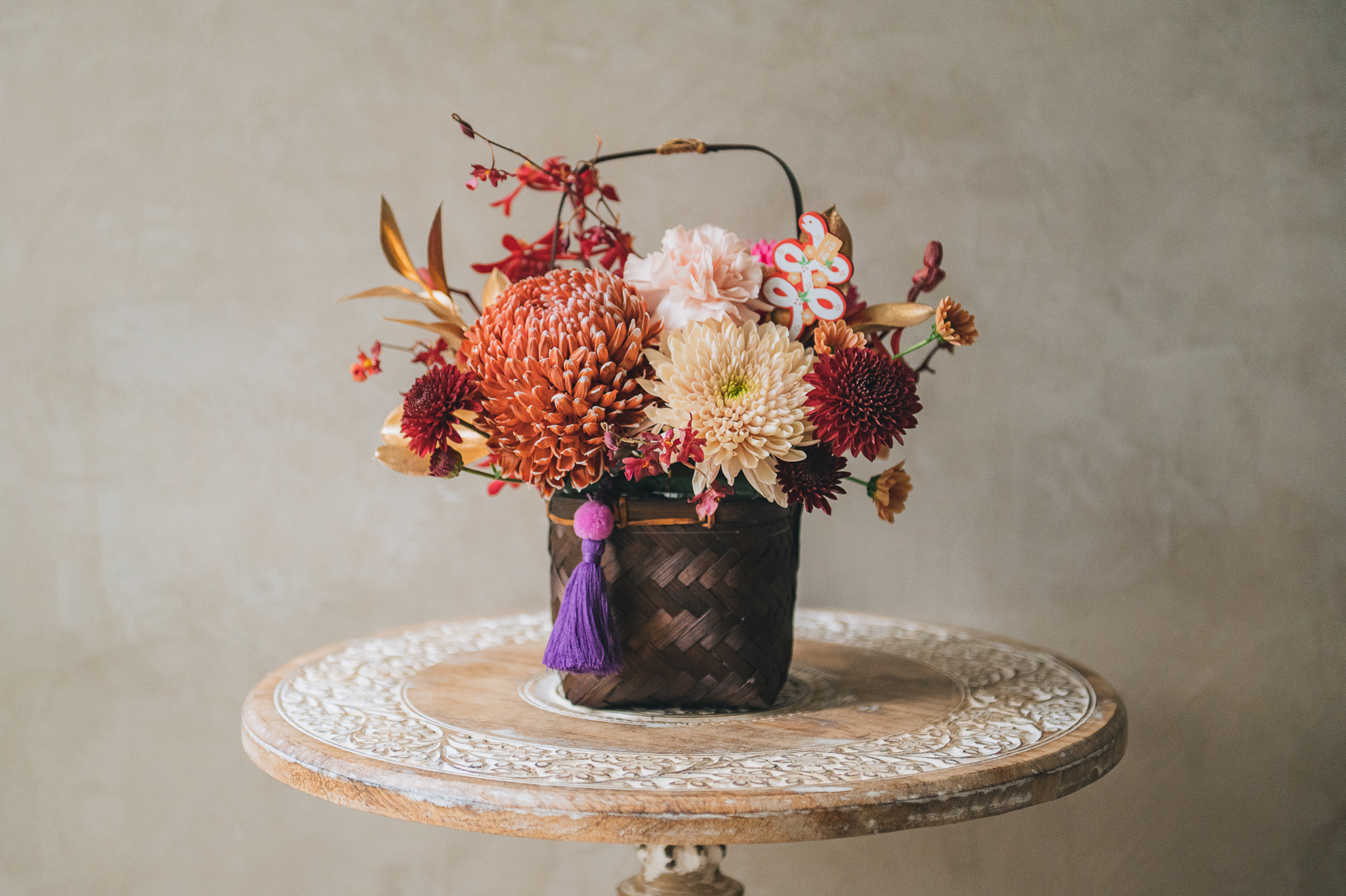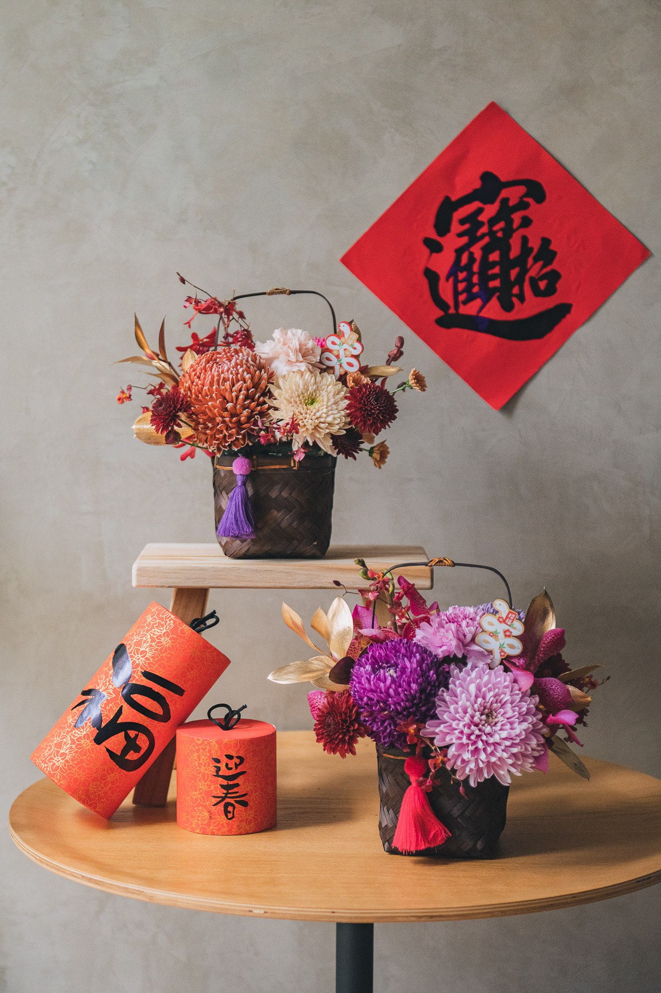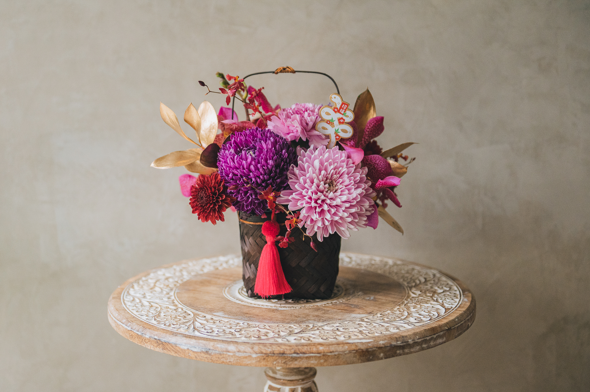 以精緻的手工竹編花籃為器,搭配豐富的菊花組合,呈現新春的喜慶氣息。可選擇紫粉色系或古典橘色系兩款風格,各自搭配不同色調的流蘇點綴,展現獨特的新年美感。金色葉片與紅色蘭花的妝點,讓整體設計更顯豐富。