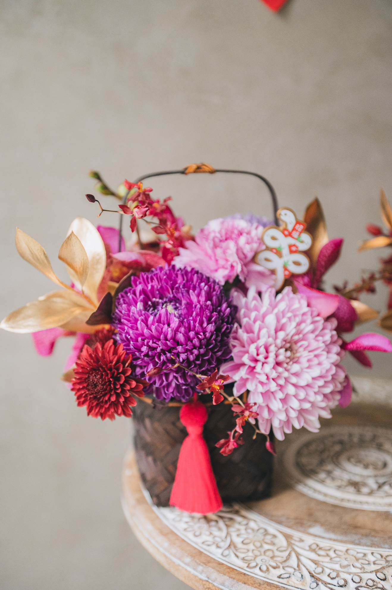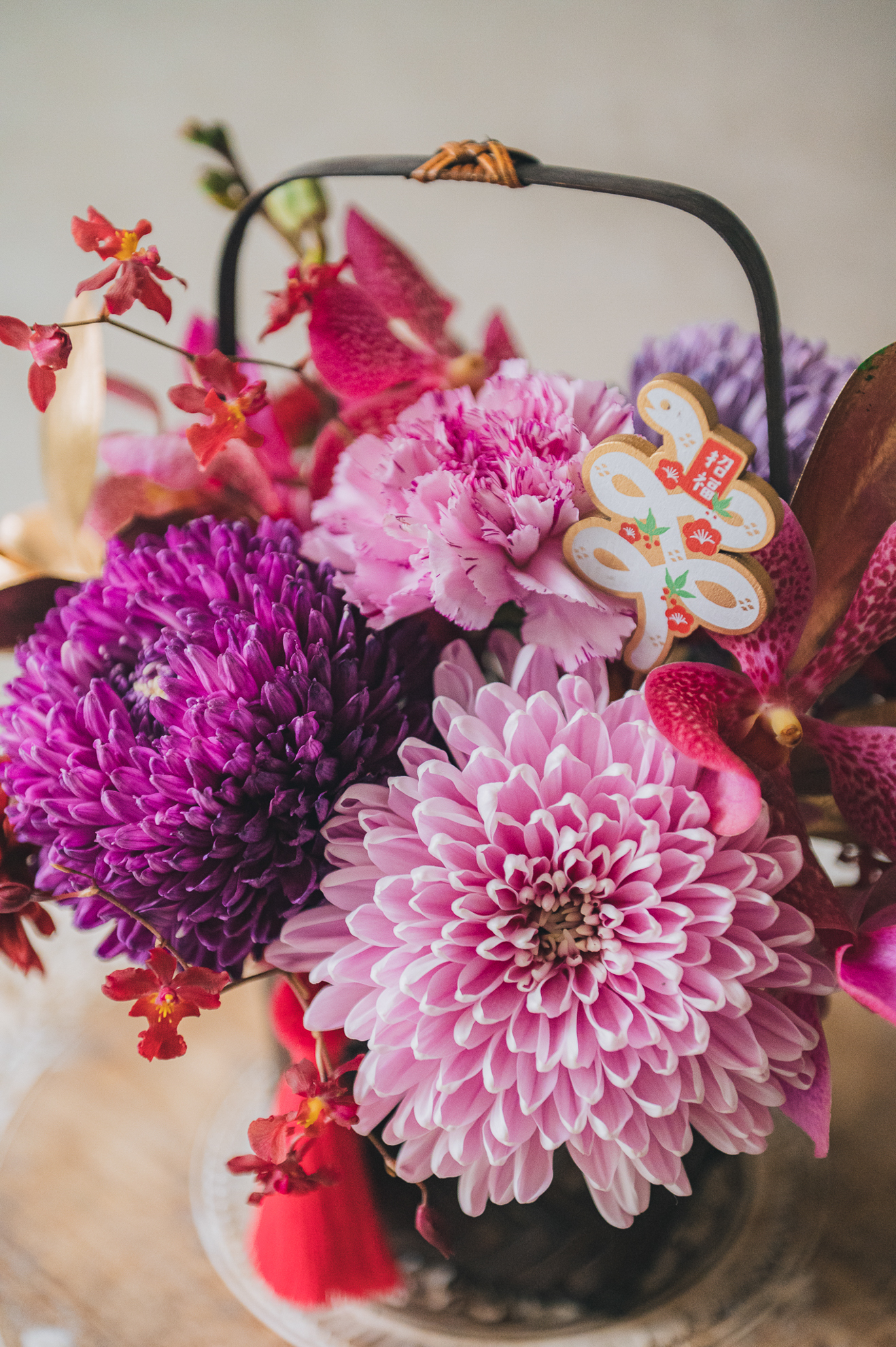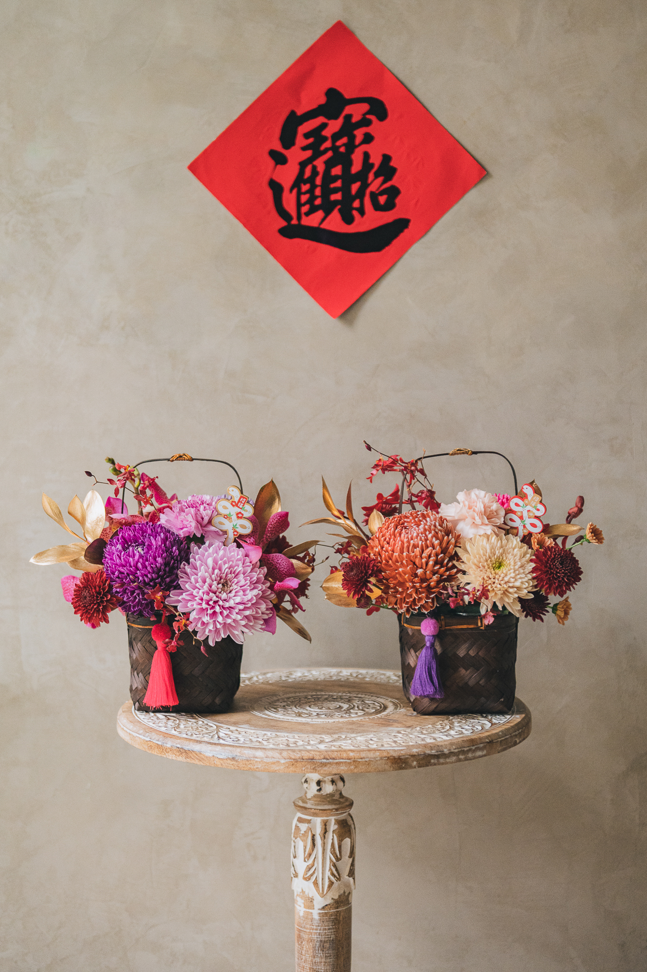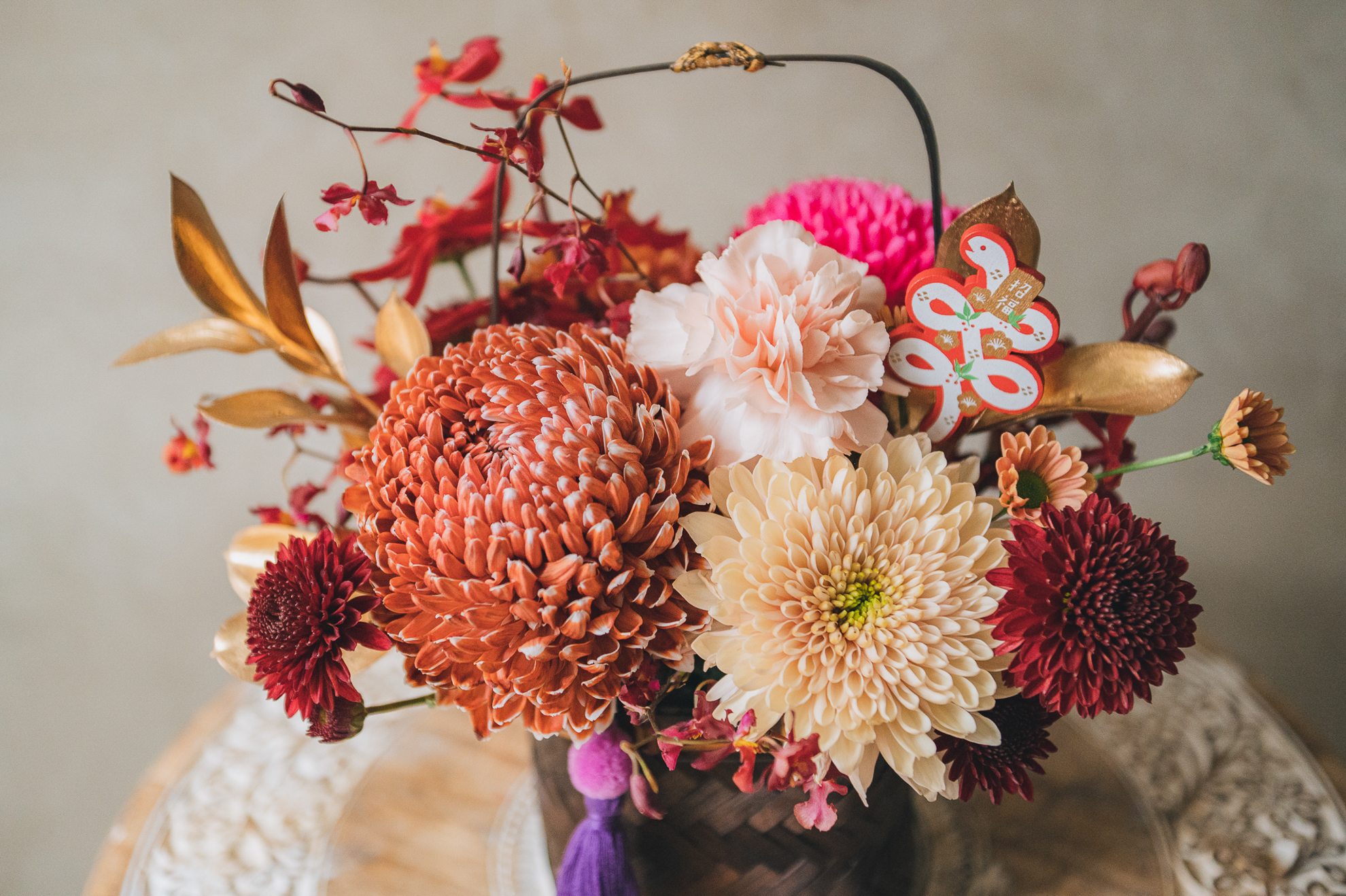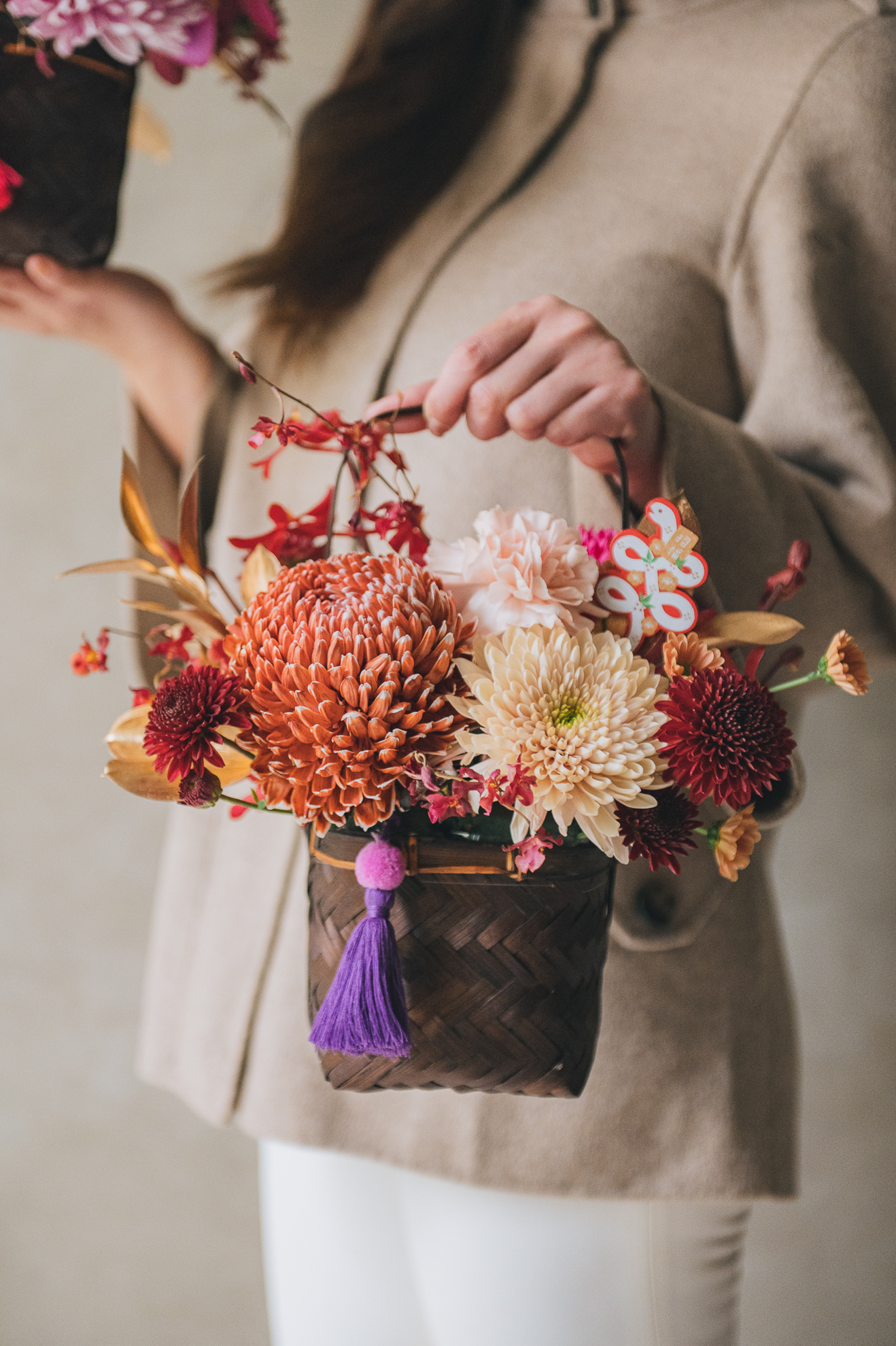 以精緻的手工竹編花籃為器,搭配豐富的菊花組合,呈現新春的喜慶氣息。可選擇紫粉色系或古典橘色系兩款風格,各自搭配不同色調的流蘇點綴,展現獨特的新年美感。金色葉片與紅色蘭花的妝點,讓整體設計更顯豐富。